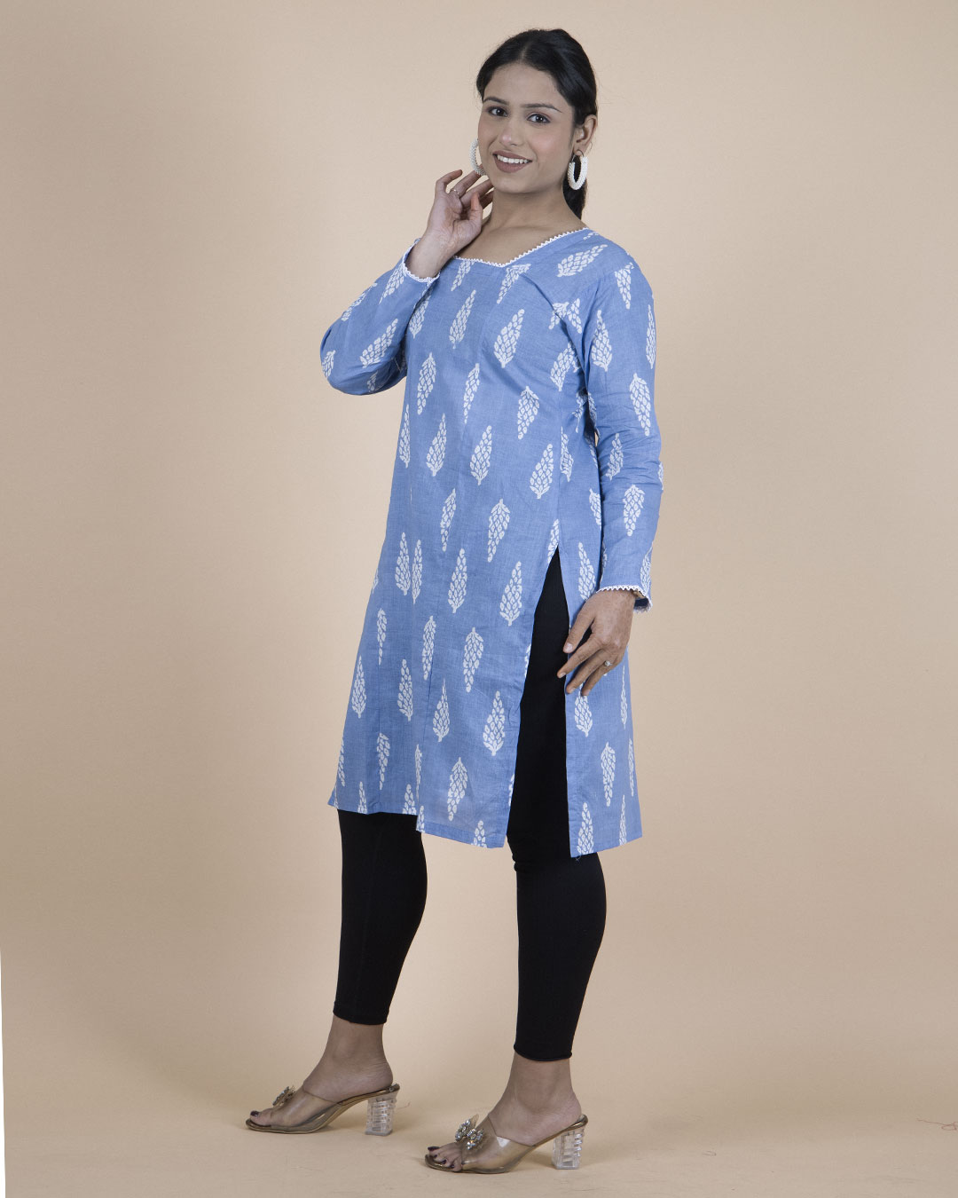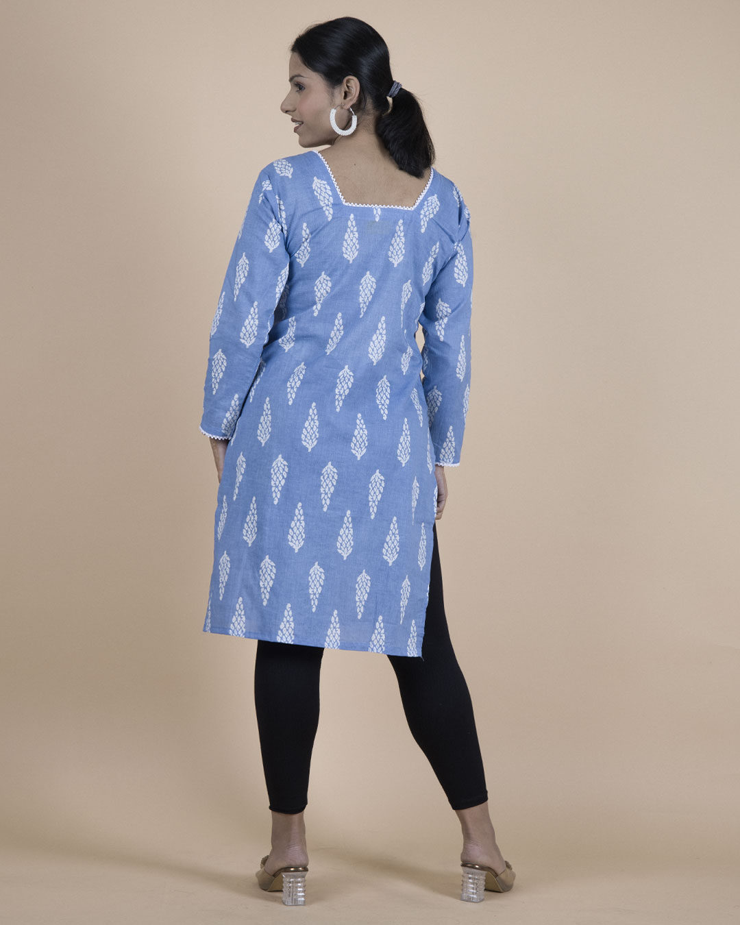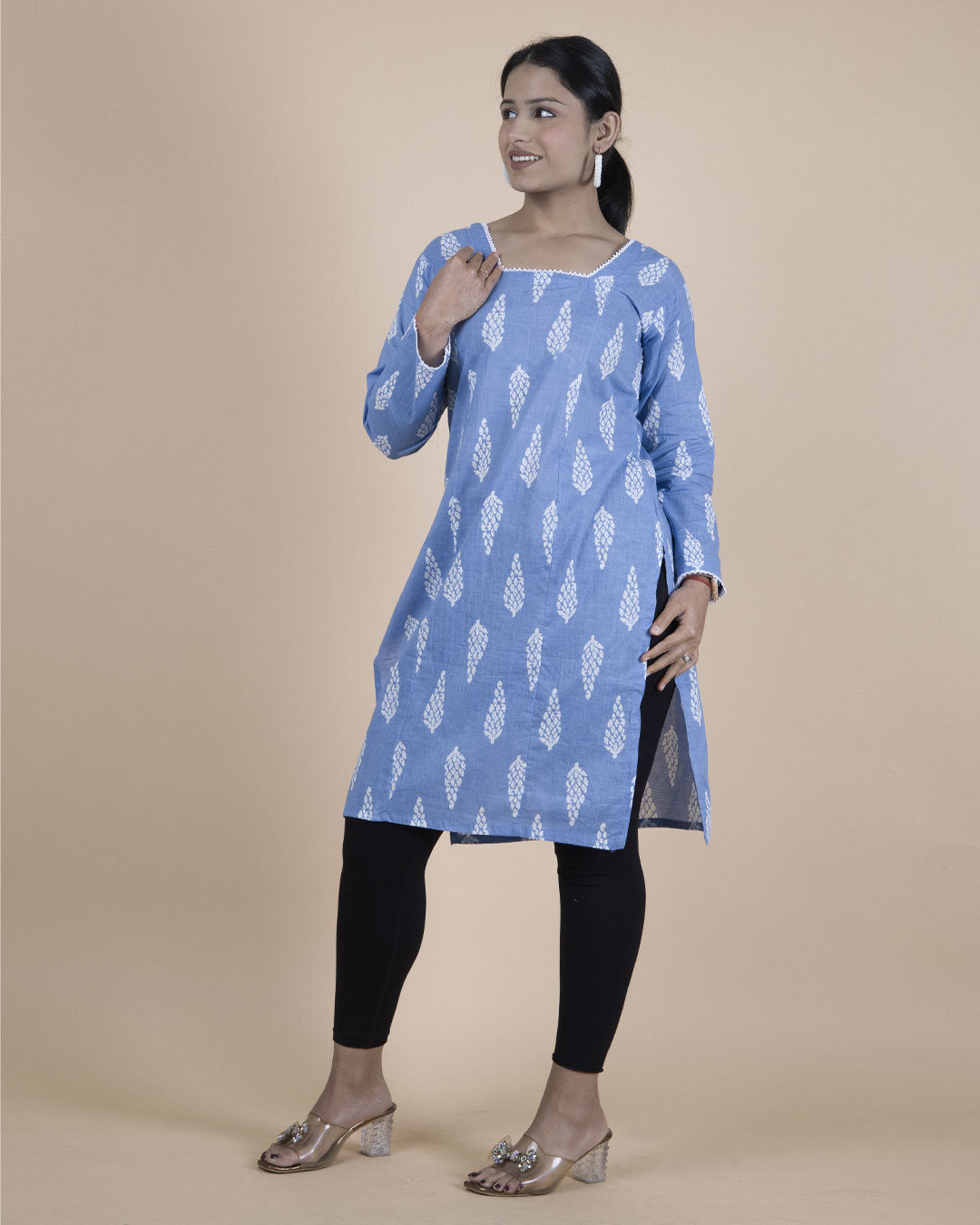 Refresh your ethnic wardrobe with this soothing blue cotton kurta featuring delicate white handblock-inspired prints. Crafted from breathable cotton fabric, this kurta offers all-day comfort while maintaining a graceful traditional appeal. The square neckline is neatly finished with subtle lace detailing, adding a refined touch to the overall design.