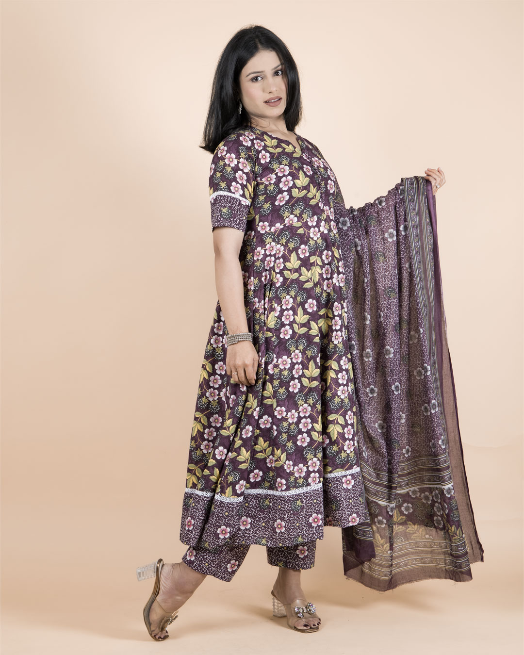 The kurta is styled in a flared A-line silhouette, offering graceful movement and a flattering fit. It comes with short sleeves and a modest neckline, making it perfect for all-day wear. The set is paired with matching printed straight-fit pants and a coordinated printed cotton dupatta, completing the look with a refined ethnic touch.