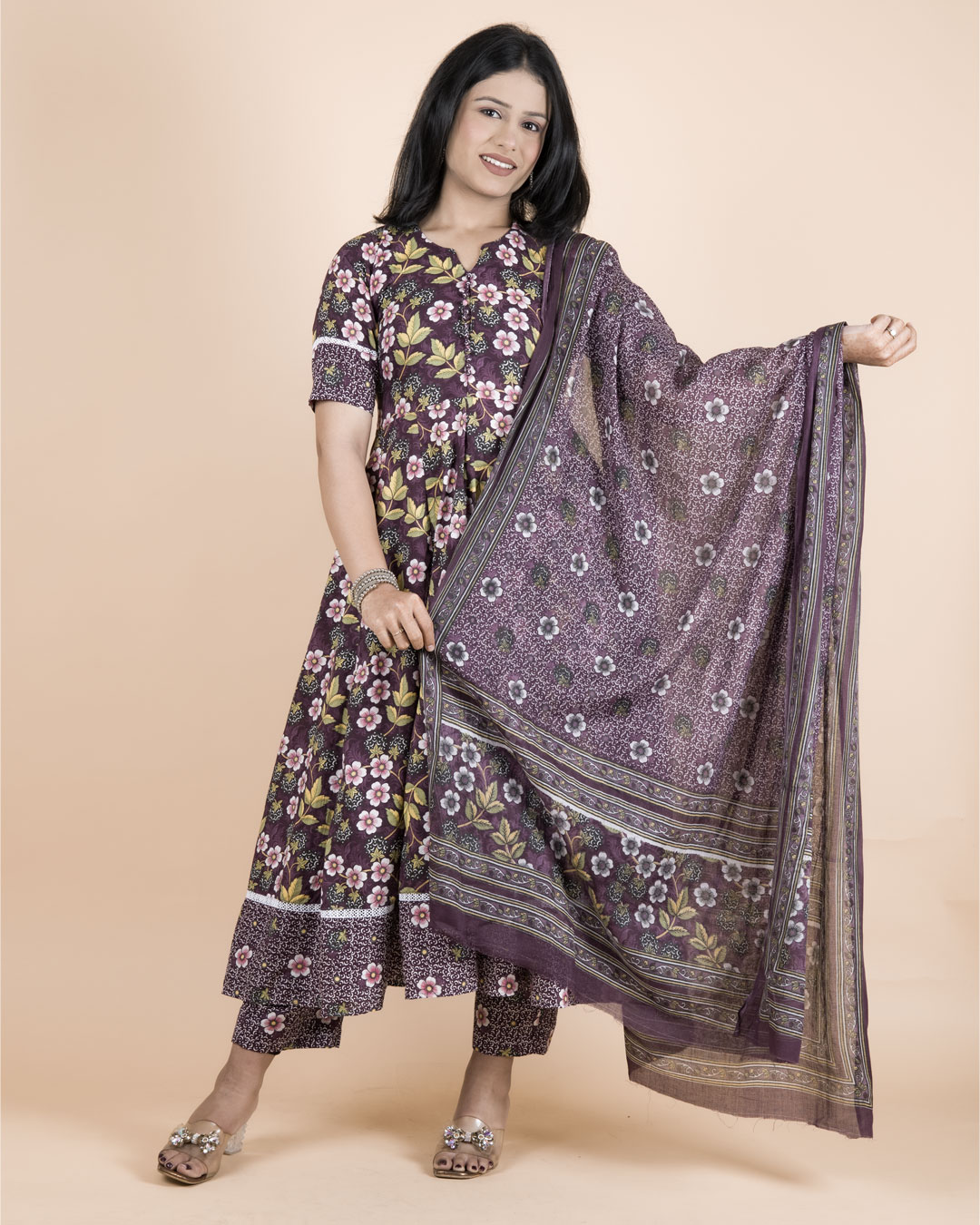 Step into effortless ethnic elegance with this beautifully crafted purple cotton kurta set, designed to blend comfort with timeless style. Made from soft, breathable cotton fabric, the kurta features an enchanting all-over floral print accented with contrasting printed borders that add depth and traditional charm.